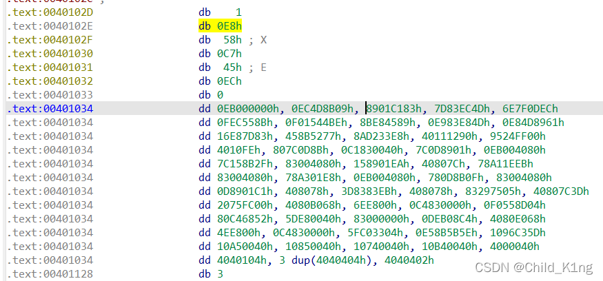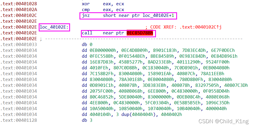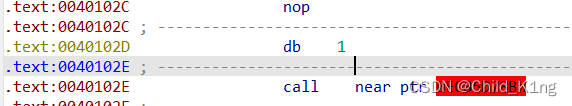 ?下面call了一个错误的地址。先按d转化为数据(不能直接全nop掉,因为里面可能有有用的数据)