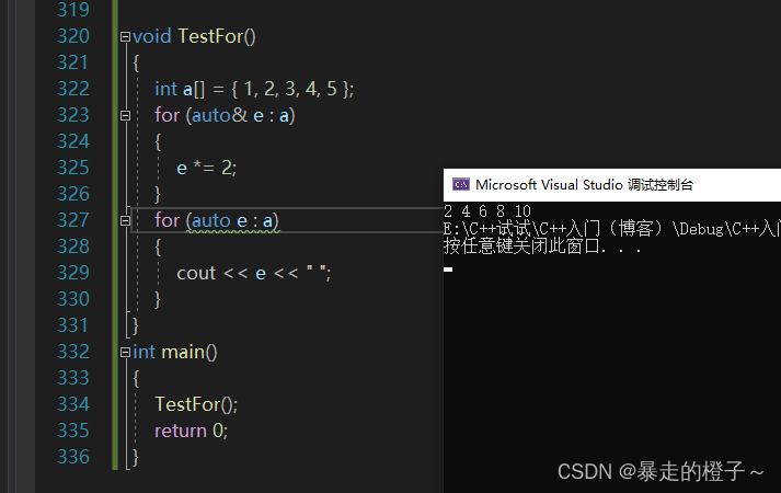 ? ? ? ?对于一个有范围的集合而言,由程序员来说明循环的范围是多余的,有时候还会容易犯错误。因此C++11中引入了基于范围的for循环。for循环后的括号由冒号“ :”分为两部分:第一部分是范围内用于迭代的变量,第二部分则表示被迭代的范围。