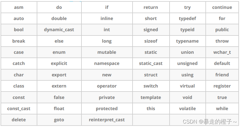 C++总计63个关键字,C语言32个关键字。