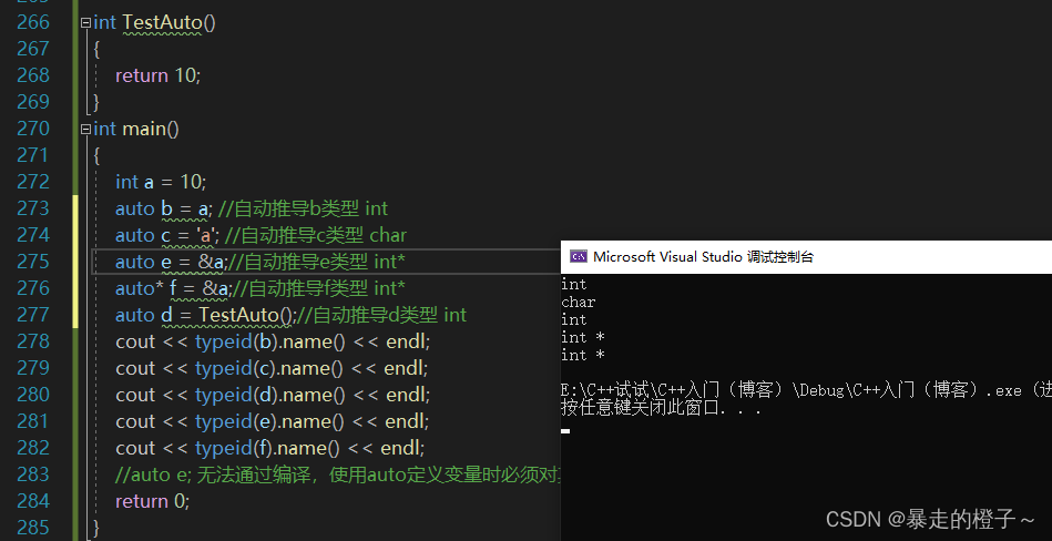 注意:使用auto定义变量时必须对其进行初始化,在编译阶段编译器需要根据初始化表达式来推导auto的实际类型。因此auto并非是一种“类型”的声明,而是一个类型声明时的“占位符”,编译器在编译期会将auto替换为变量实际的类型。