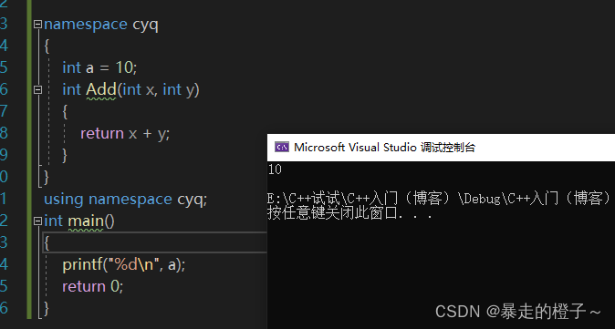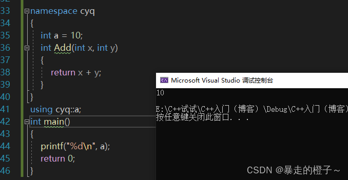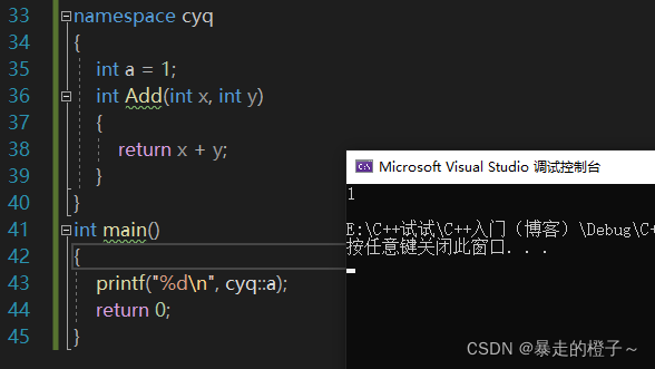 ? ? ? ?注意,虽然cyq和wmm两个命名空间中都有定义变量a,但是在这里并不会造成命名冲突。因为他们在不同的命名空间中,属于不同的作用域。这就避免了命名冲突或命名污染。