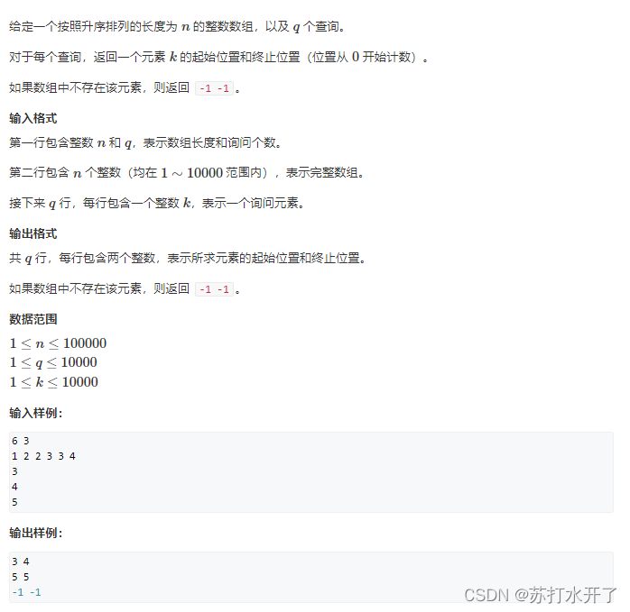 ????????给定一个按照升序排列的长度为 n 的整数数组,以及 q 个查询。对于每个查询,返回一个元素 kk 的起始位置和终止位置(位置从 0 开始计数)。如果数组中不存在该元素,则返回 -1 -1 。