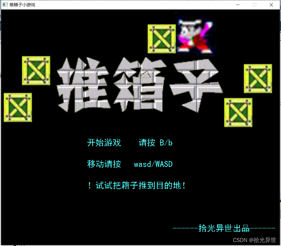outtextxy(240,480,_T("!试试把箱子推到目的地!"));