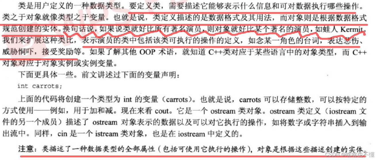 ?这是c ++ primer plus里面的类的介绍。最重要的一句:类描述了一种数据类型的全部属性(包括可使用它执行的操作),对象是根据这些描述创建的实体。