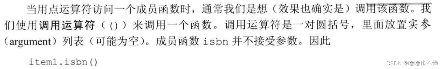 意思就是调用名为isbn的成员函数(member function)。成员函数是定义为 类的一部分 的函数,有时也被称为方法(method)。我们通常以一个类对象的名义来调用成员函数。