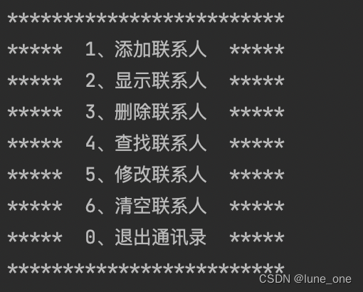 1.系统需求系统中需要实现的功能如下: ·添加联系人:向通讯录中添加新人,信息包括(姓名、性别、年龄、联系电话、家庭住址)最多纪录1000人 ·显示联系人:显示通讯录中所有联系人信息 ·删除联系人:按照姓名进行删除指定联系人 ·查找联系人:按照姓名查看指定联系人信息 ·修改联系人:按照姓名重新修改联系人 ·清空联系人:清空通讯录中所有信息 ·退出通讯录:退出当前使用的通讯录 2.通讯录管理系统-菜单功能功能描述:用户选择功能的界面 菜单界面效果如下