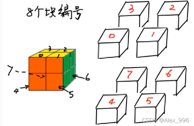 二阶魔方是由八个块组成的,我们先给这8个块进行编号,上面四个块编号为03,下面四个块编号为47。