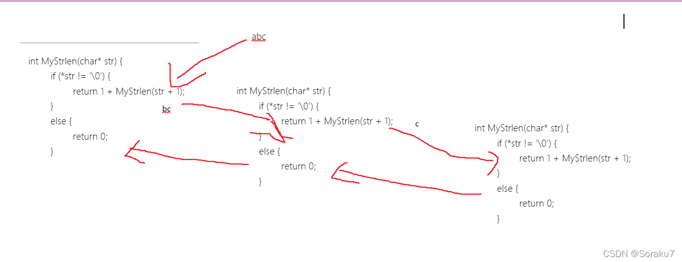 递归的思想应该是这样MyStrlen(abc)这个函数每一次调用都获得字符串的第一个字符,调用一次就应该是1+MyStrlen(bc),调用第二次就应该是1+1+MyStrlen(c),再调用最后一次1+1+1+MyStrlen()?这样的函数其实也能求出字符串的长度。函数递归无非是大事化小,小事化了的思想。每次从字符串中取出一个字符