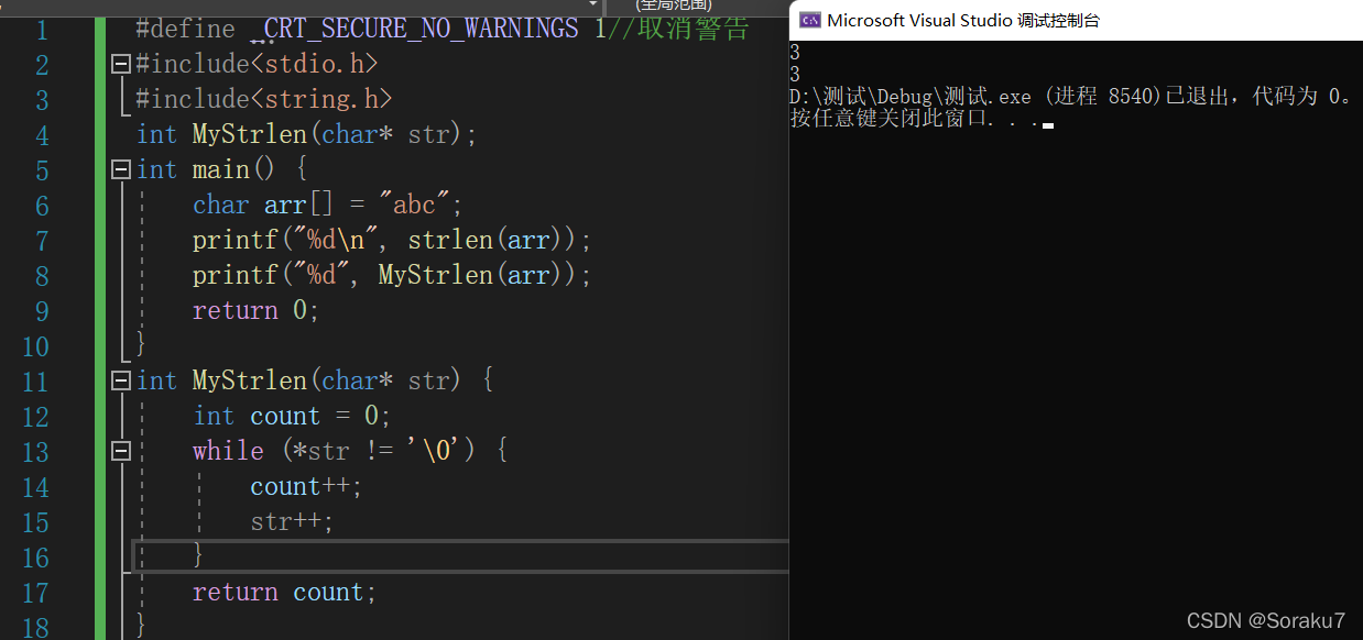 这样的一个MyStrlen就算是简单的实现了strlen这个函数