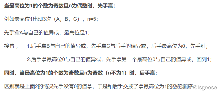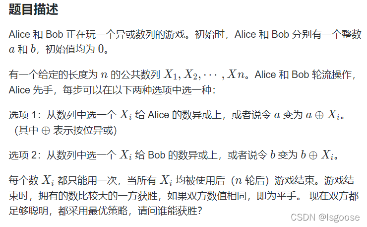 如果是平局,A^B=0其实等价于所有输入的数异或等于0