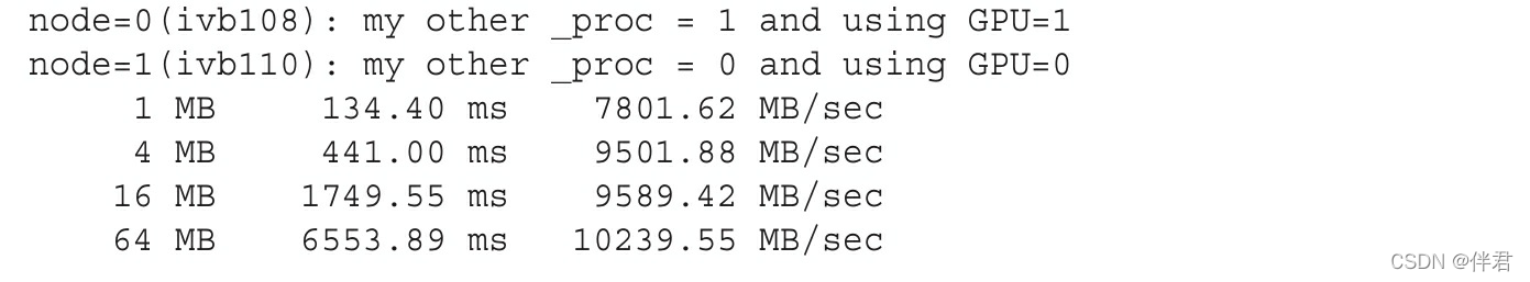 相比之下,可以使用CUDA-aware MVAPICHA2-GDR版本中的mpicc编译相同的程序。确保设置MV2_USE_GPUDIRECT环境变量作为mpirun_rsh命令的一部分。代码如下所示:  在同一个集群上显示以下结果: