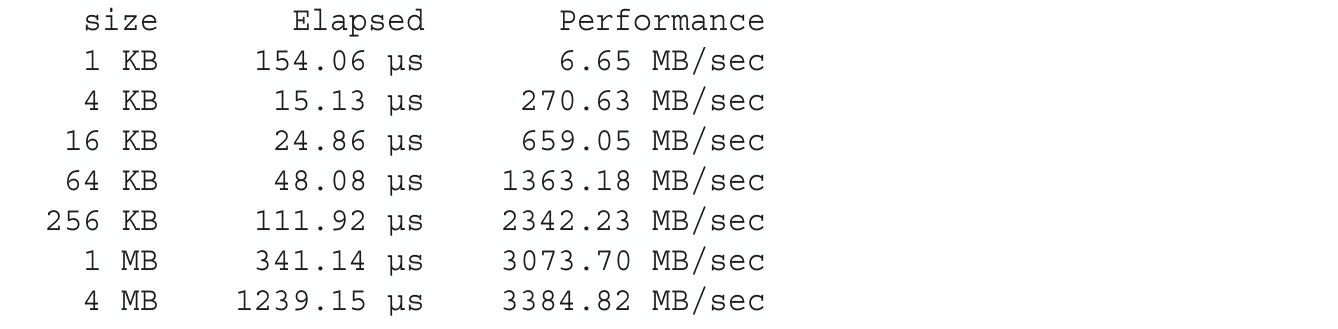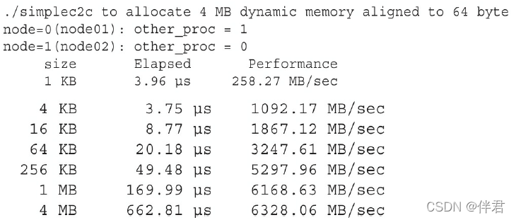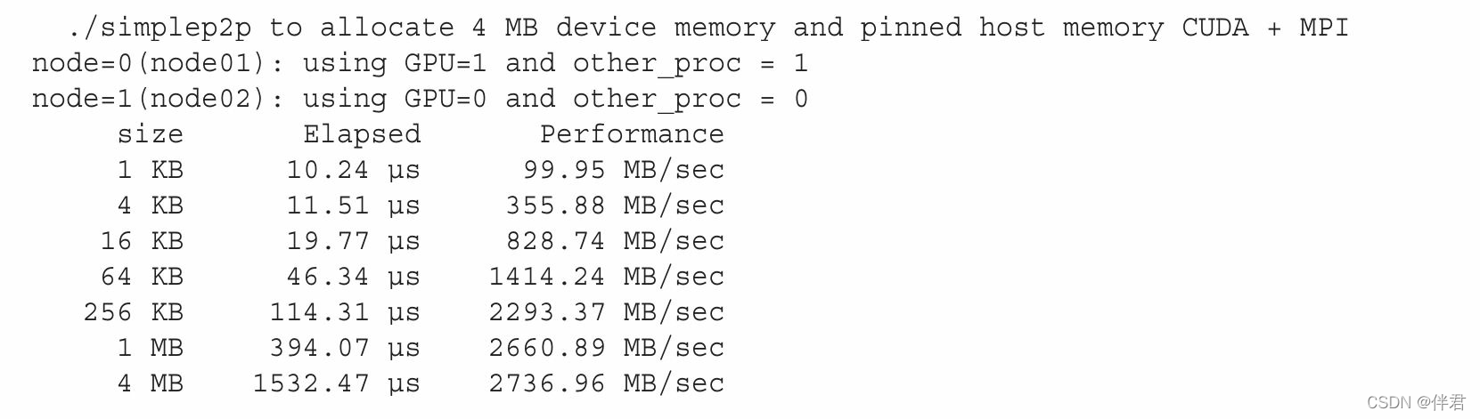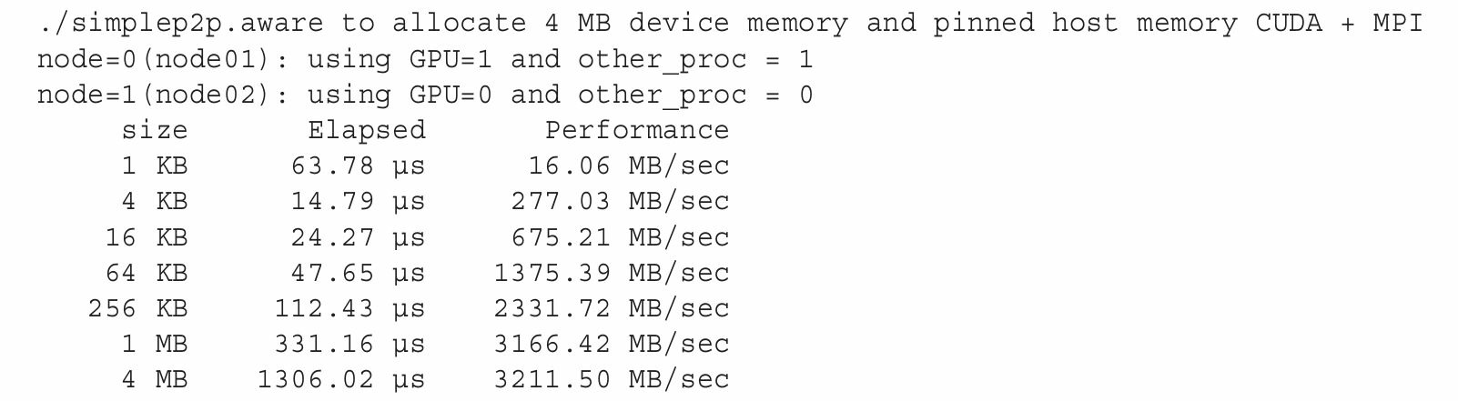 使 用 CUDA-aware MPI 进 行 节 点 内 GPU 到 GPU 的 数 据 传 输 在同一节点的两个GPU间,也可以使用CUDA-aware MPI库执行数据传输。如果两个GPU连接在同一个PCIe总线上,会自动使用点对点传输。我们此处还使用前面用过的例子,在同一节点进行两GPU之间的数据传输,假定node01至少有两个GPU:$ mpirun_rsh -np 2 node01 node01 MV2_USE_CUDA=1 ./simplep2p.aware ,在有两个Fermi M2090的GPU上,结果如下。与预想的一致,在同一节点的GPU之间通过PCIe总线传输数据比跨节点互连的传输会有更好的带宽和延迟。