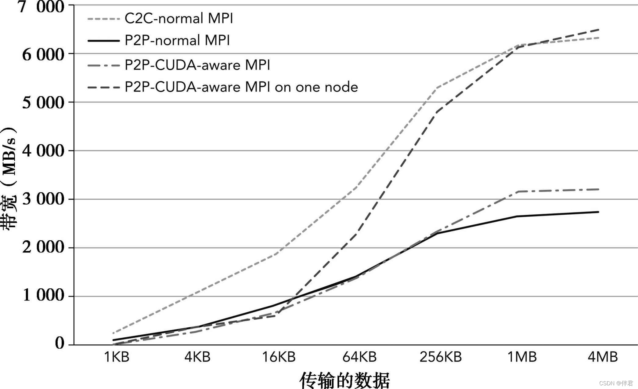 对InfiniBand集群而言,MVAPICH2是一个被广泛使用的开源MPI库,并且支持从一个GPU设备内存到另一个GPU的设备内存间直接进行MPI通信。接下来将使用MVAPICH平台来测试以下情况: