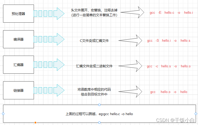 ????????-E | ? ? ? ? 将源文件预处理为预处理后的源文件 | ????????-S | ? ? ? ? 将预处理后的源文件编译成汇编文件 | ????????-c | ? ? ? ? 将汇编文件汇编成二进制文件 | ????????-o | ? ? ? ? 将二进制文件通过链接形成可执行文件 | ? ? ? ? -I(大i | ? ? ? ? 指定include包含文件的搜索路径 | ? ? ? ? -g | ? ? ? ? 生成调试信息,该程序可以被调试器调试 | ? ? ? ? -D | ? ? ? ? 在程序编译的时候指定宏(Debug/Relese版) | ? ? ? ? -w | ? ? ? ? 不生成任何警告信息 | ? ? ? ? -wall | ? ? ? ? 生成所有警告信息 | ? ? ? ? -l(小L) | ? ? ? ? 在程序编译的时候指定使用的库 | ? ? ? ? -L | ? ? ? ? 在程序编译的时候,搜索库的路径 | ? ? ? ? -fPIC | ? ? ? ? 生成与位置无关的代码 | ? ?-shared | ? ? ? ? 生成共享目标文件,通常用在建立共享库时 | ? ? ? ? -std | ? ? ? ? 指定c方言,即c的版本 | ? ? ? ? -On | ? ? ? ? 优化级别(0-3依次增高) |