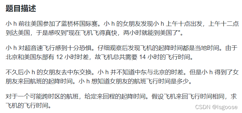 首先是思路,既然每组数据都是去的和回来的两个时间,我们可以忽略时差,为什么呢?因为抵消了。所以我们的时间就是两个时间的end-start相加之后除以二就是航班飞行时间了对吧。