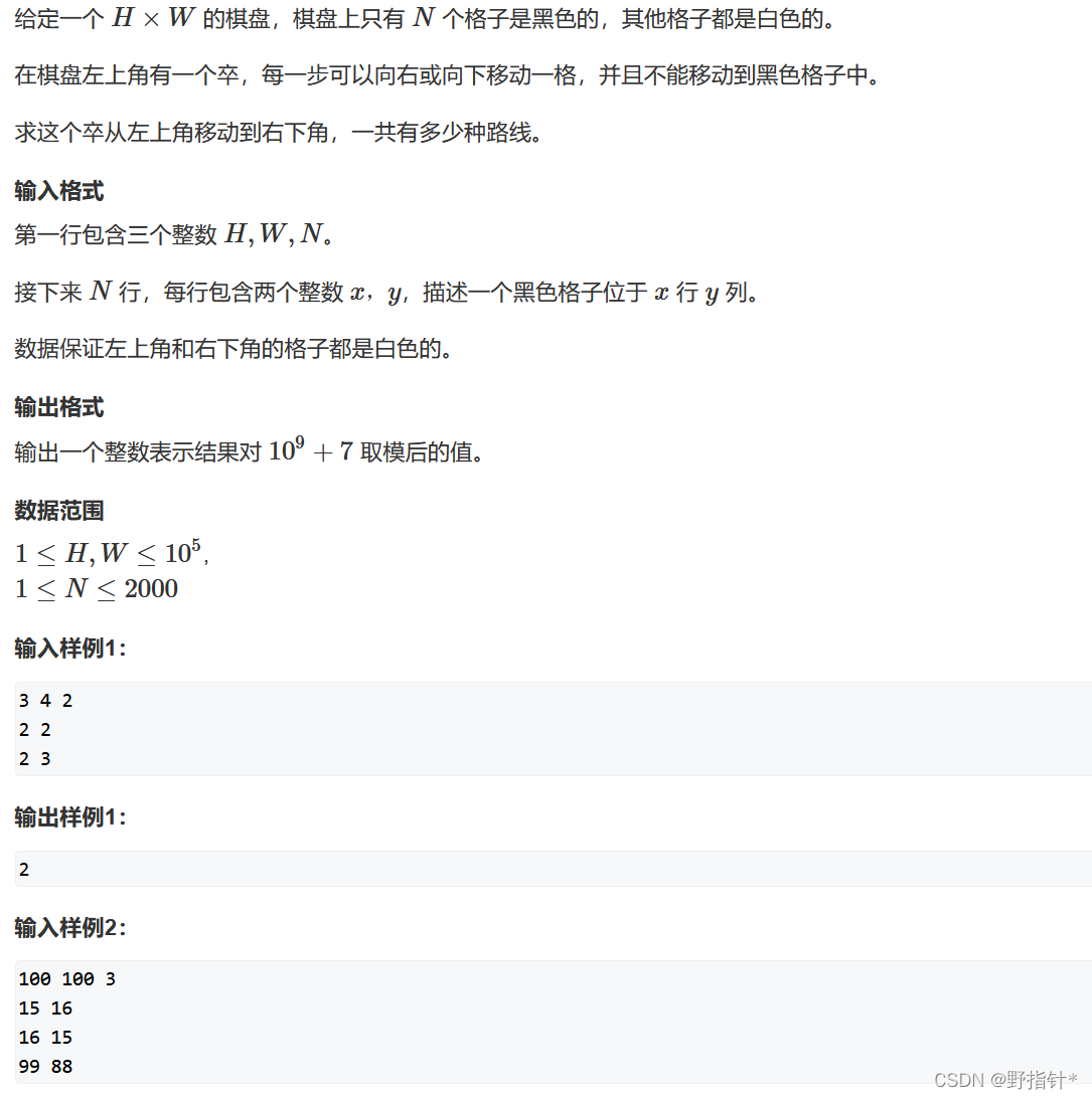 假设F[i]为从左上角走到排序后的第i个黑色格子,并且途中不经过其他格子的路线数.