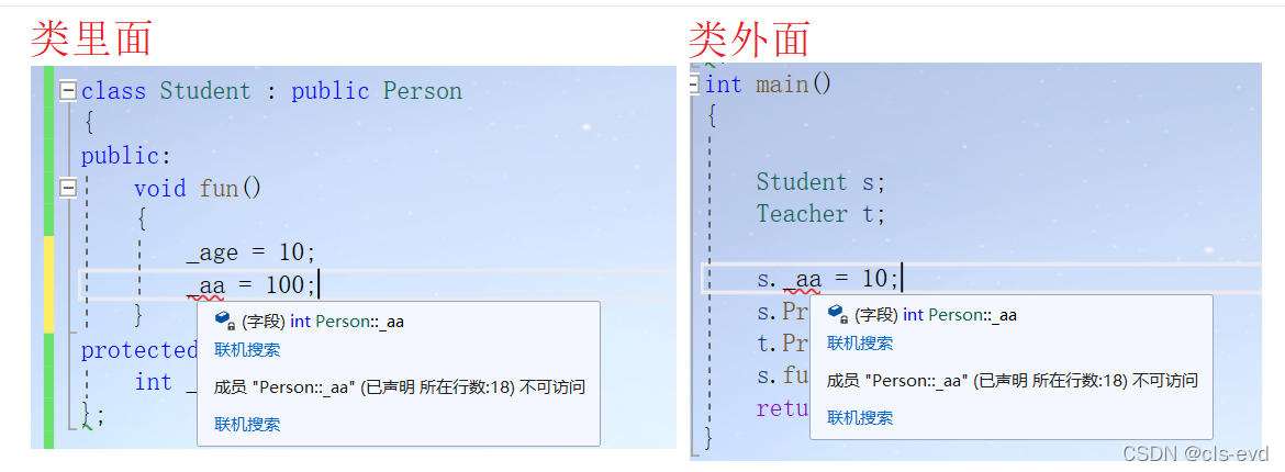 但是这并不会影响到派生类去访问基类中的public成员和protected成员,也不会影响类外面去访问派生类的public成员。