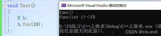 解析:改题与上题非常的相似,仅仅是b调用的函数不同,但是两个fun()构成了隐藏,所以此时再去调用父类的fun()就会报错,因为它被隐藏了。如果现在想去调用父类中的fun()可以通过指定类域访问。