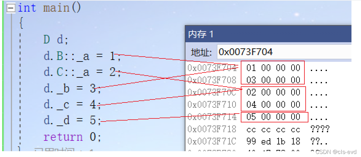 不使用虚继承的内存窗口:通过这个内存窗口发现,先继承的B是排在后继承的C的前面,最后继承的D在最后 ?eg:如果先继承C,再继承B,C就排在B的前面