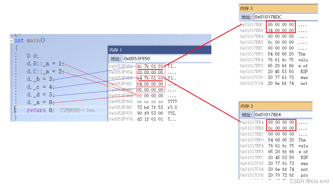 由于我们的机器是小端字节序,从右向左读,一个是01017bdc,一个是01017be4.我们在通过一个内存窗口去看。