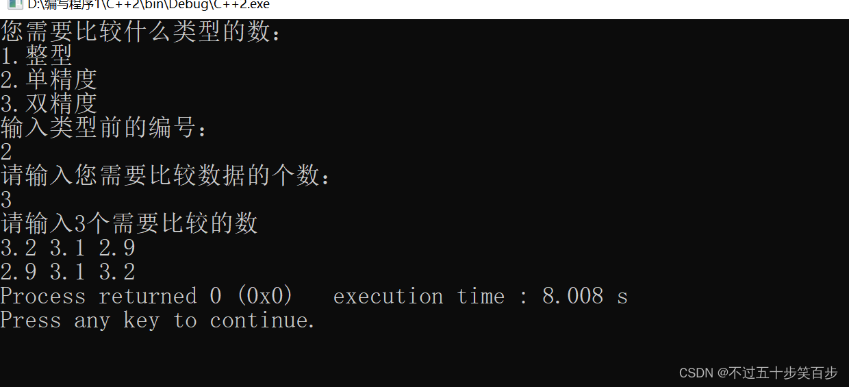cout << "您需要比较什么类型的数:\n1.整型\n2.单精度\n3.双精度" << endl << "输入类型前的编号:" << endl;
