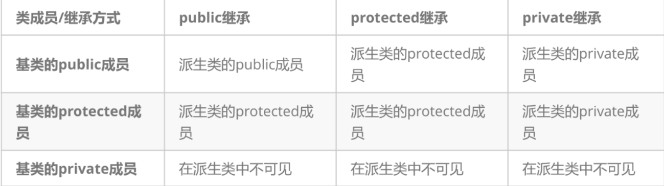 1. 基类private成员在派生类中无论以什么方式继承都是不可见的。这里的不可见是指基类的私有成员还是被继承到了派生类对象中,但是语法上限制派生类对象不管在类里面还是类外面都不能去访问它。 2. 基类private成员在派生类中是不能被访问,如果基类成员不想在类外直接被访问,但需要在派生类中能访问,就定义为protected。可以看出保护成员限定符是因继承才出现的。 3. 实际上面的表格我们进行一下总结会发现,基类的私有成员在子类都是不可见。基类的其他成员在子类的访问方式 == Min(成员在基类的访问限定符,继承方式),public > protected > private。 4. 使用关键字class时默认的继承方式是private,使用struct时默认的继承方式是public,不过最好显示的写出继承方式。 5. 在实际运用中一般使用都是public继承,几乎很少使用protetced/private继承,也不提倡使用protetced/private继承,因为protetced/private继承下来的成员都只能在派生类的类里面使用,实际中扩展维护性不强。