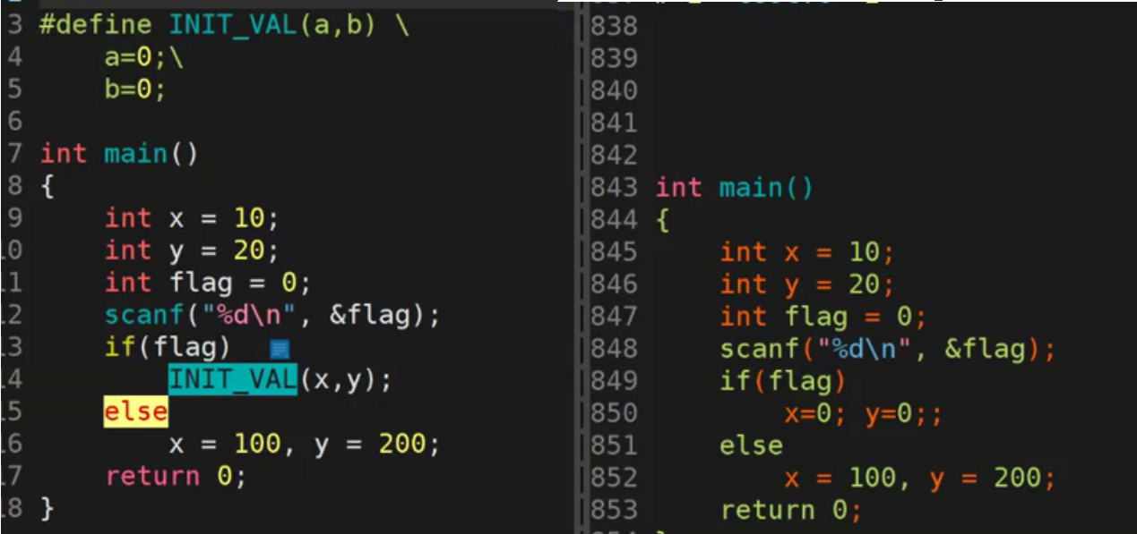 - ?这段代码中的宏替换的时候,替换了多条语句,而在没有{? }的情况下,if和else只能匹配一条语句,所以这里会报错