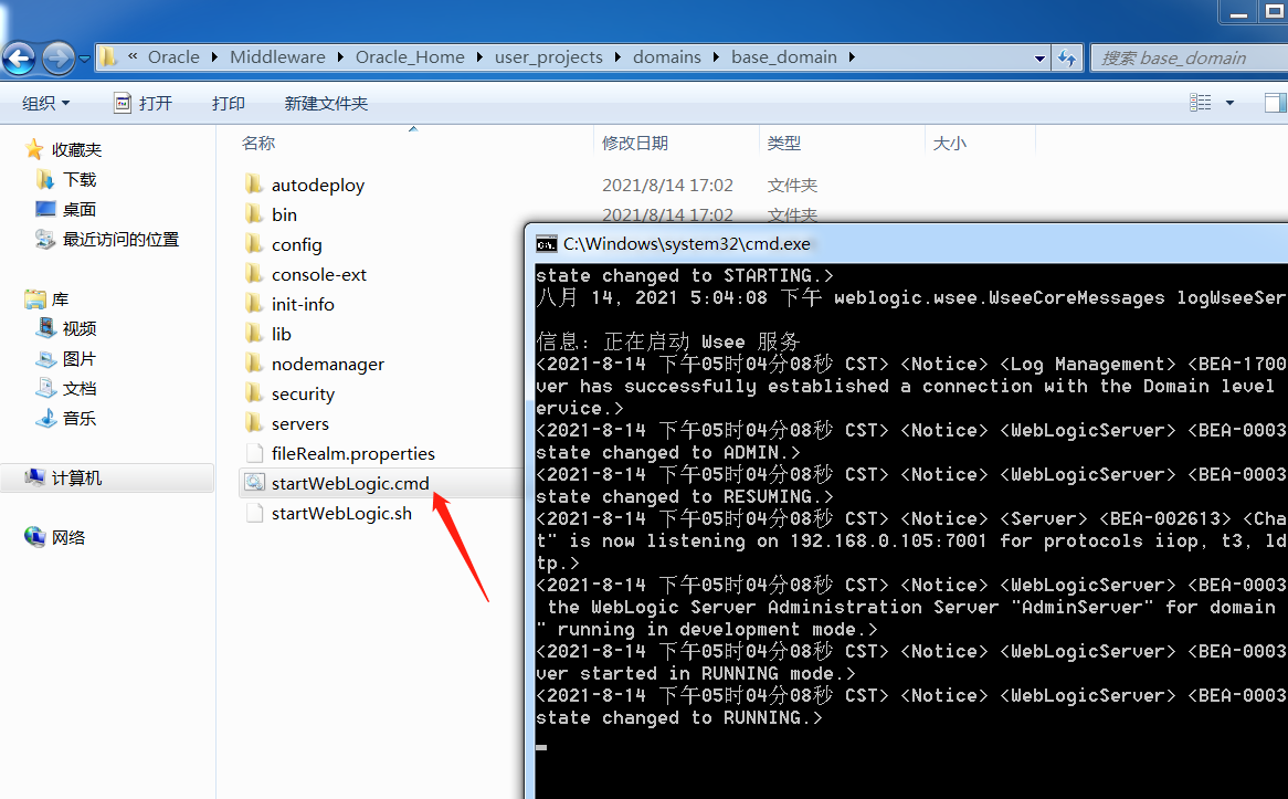 进入该目录下,双击红框中的startWebLogic.cmd,启动weblogic