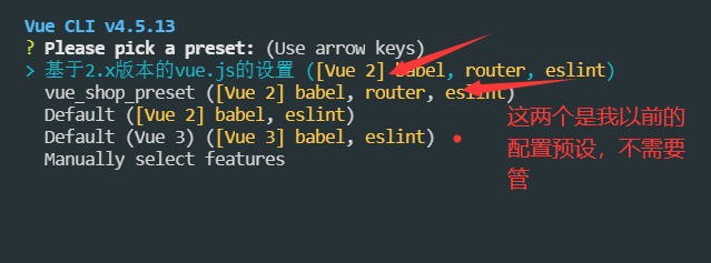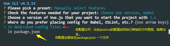 vue create 项目的过程通过方向键进行上下移动,空格表示选中,回车则进入下一项的配置。