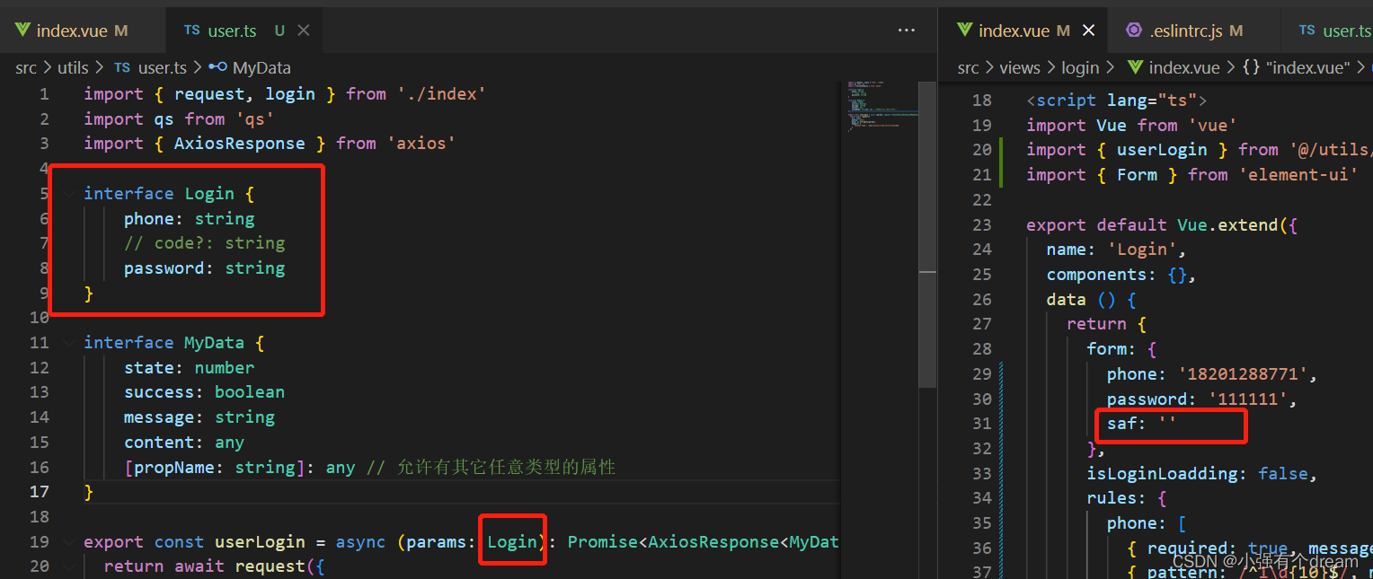 传递了非无用的参数,ts没有检测报错  而在在线ts中正常报错 interface Login { phone: string // code?: string password: string } const hello : Login = { phone: ‘18201288771’, password: ‘111111’, saf: ‘’ } console.log(hello) -