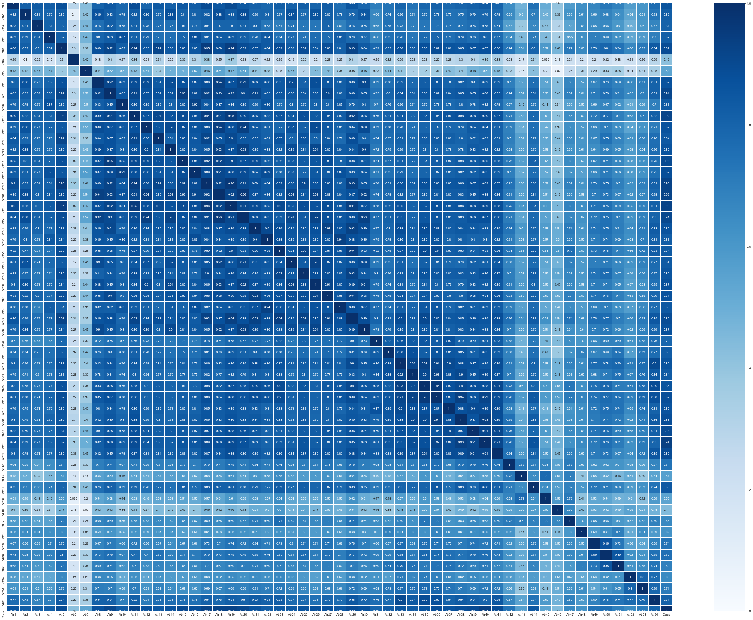 sns.heatmap(data_train.corr(),annot=True, cmap='Blues', vmin = 0.0, vmax = 1 ,linewidths=1)