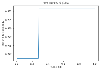 # 逻辑回归,采用10折交叉验证,用准确率来评估,发现曲线在C=0.4时收敛。