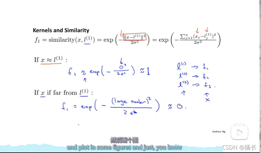 3.选择标记点(Choosing the landmarks) Wher to get l^(1) , l(2),l(3),…? 实际问题中,我们的想法是:将选取样本点,直接使用我们拥有的每一个样本点,直接将训练样本作为标记点;例如:如果我们有一个训练样本点x1,那么我们将在这个训练样本点完全相同的位置上,选作我的第一个标记点;如果我有另一个训练样本x2,那么第二个标记点则在与第二个样本点一致的位置上; 这种选择标记点的方法说明特征函数基本上是在描述每一个样本距离样本集中其他样本的距离。