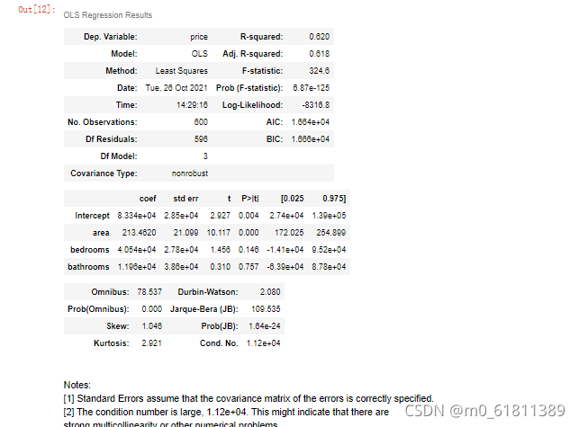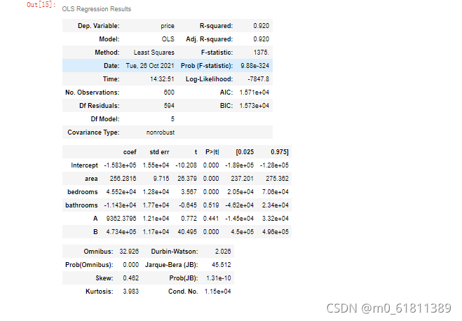 lm = ols('price ~ area + bedrooms + bathrooms + A + B', data=results).fit()