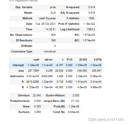 lm = ols(formula='price ~ area + bathrooms + A + B', data=results).fit()