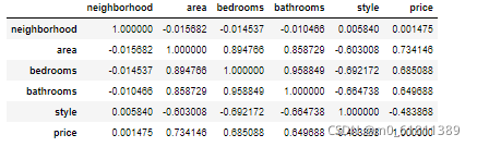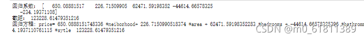 print('回归方程: price=',model.coef_[0],'*neiborhood+',model.coef_[1],'*area +',model.coef_[2],'*bedrooms +',model.coef_[3],'*bathromms +',model.coef_[4],'*sytle ',model.intercept_)