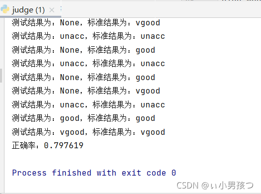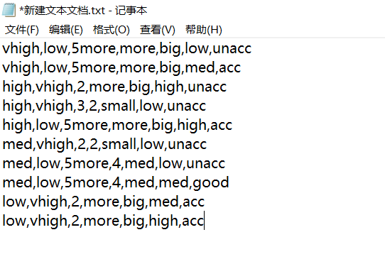 其中,前五列为标签分别为:buying,maint,doors,persons,lug_boot,safty,最后一个为决策结果,unacc表示无法接受,acc表示接受,good表示?很好,vgood表示非常好