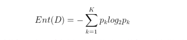 ?决策树学习的关键在于如何选择最优的划分属性,所谓的最优划分属性,对于二元分类而言,就是尽量使划分的样本属于同一类别,即“纯度”最高的属性。那么如何来度量特征(features)的纯度,这时候就要用到“信息熵(information entropy)”。先来看看信息熵的定义:假如当前样本集D中第k类样本所占的比例为, 为类别的总数(对于二元分类来说,)。则样本集的信息熵为:
