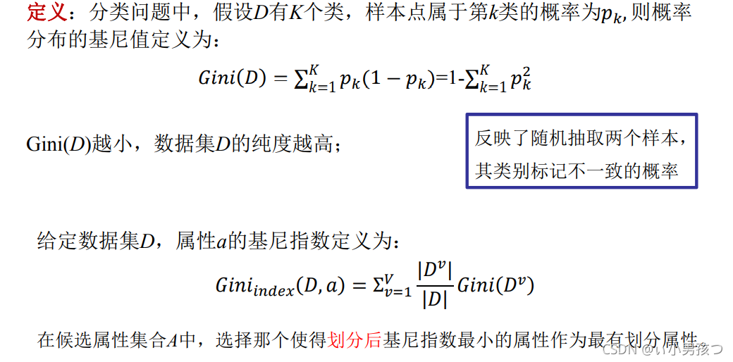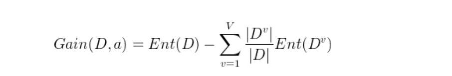 Ent(D)的值越小,则D的纯度越高。(这个公式也决定了信息增益的一个缺点:即信息增益对可取值数目多的特征有偏好(即该属性能取得值越多,信息增益,越偏向这个),因为特征可取的值越多,会导致“纯度”越大,即ent(D)会很小,如果一个特征的离散个数与样本数相等,那么Ent(D)值会为0)。再来看一个概念信息增益(information gain),假定离散属性 ?有 个可能的取值,如果使用特征 ?来对数据集D进行划分,则会产生V个分支结点, 其中第v(小v)个结点包含了数据集D中所有在特征 ?上取值为 的样本总数,记为。因此可以根据上面信息熵的公式计算出信息熵,再考虑到不同的分支结点所包含的样本数量不同,给分支节点赋予权重,即样本数越多的分支节点的影响越大,因此,能够计算出特征 ?对样本集D进行划分所获得的“信息增益”: