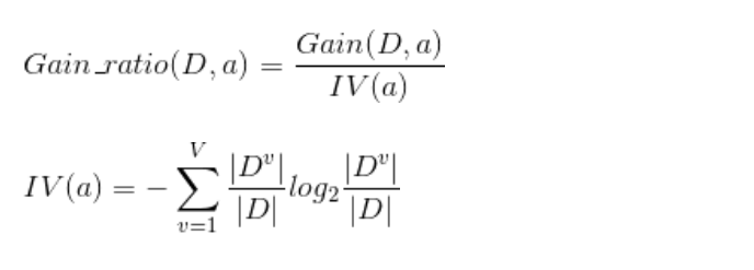 ID3算法中的信息增益准则对取值数目较多的属性有所偏好,例如西瓜数据集中,如果把“编号”也作为候选划分属性,它的信息增益为0.998,但是如果用“编号”作为划分属性显然是不合理的。为了减少这种偏好可能带来的不利影响,C4.5决策树算法中使用增益率(gain ratio)来选择最优划分属性。