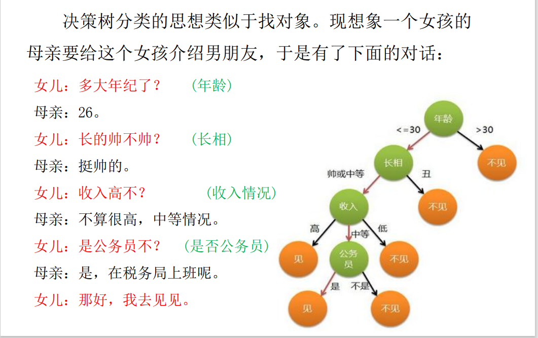 顾名思义,决策树就是一棵树,一颗决策树包含一个根节点、若干个内部结点和若干个叶结点;叶结点对应于决策结果,其他每个结点则对应于一个属性测试;每个结点包含的样本集合根据属性测试的结果被划分到子结点中;根结点包含样本全集,从根结点到每个叶子结点的路径对应了一个判定测试序列。举个例子,如下图所示: