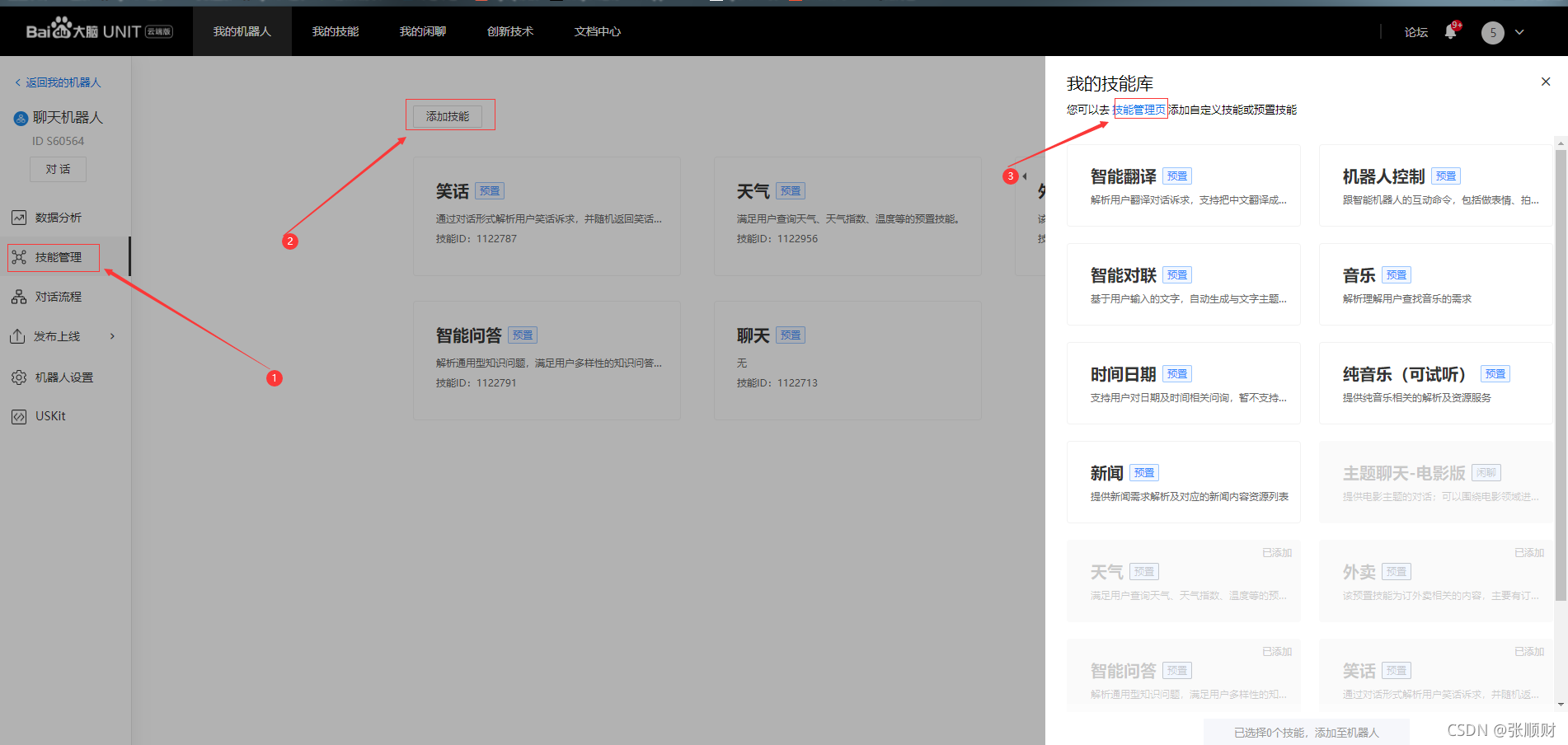 创建完机器人我们需要 为机器人添加技能,添加步骤如图所示: