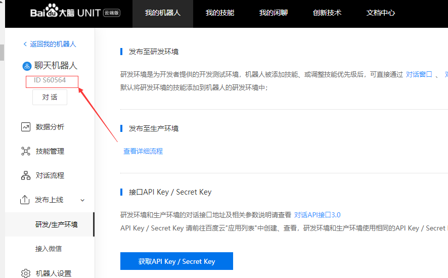 上面代码里聊天机器人的ID不是APIkey那个界面的ID,而是创建完机器人那个界面的ID。如图: