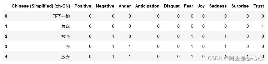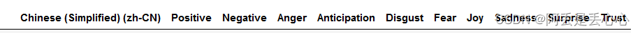 chinese_df = lexion_df[['Chinese (Simplified) (zh-CN)','Positive','Negative','Anger','Anticipation','Disgust','Fear','Joy','Sadness','Surprise','Trust']]