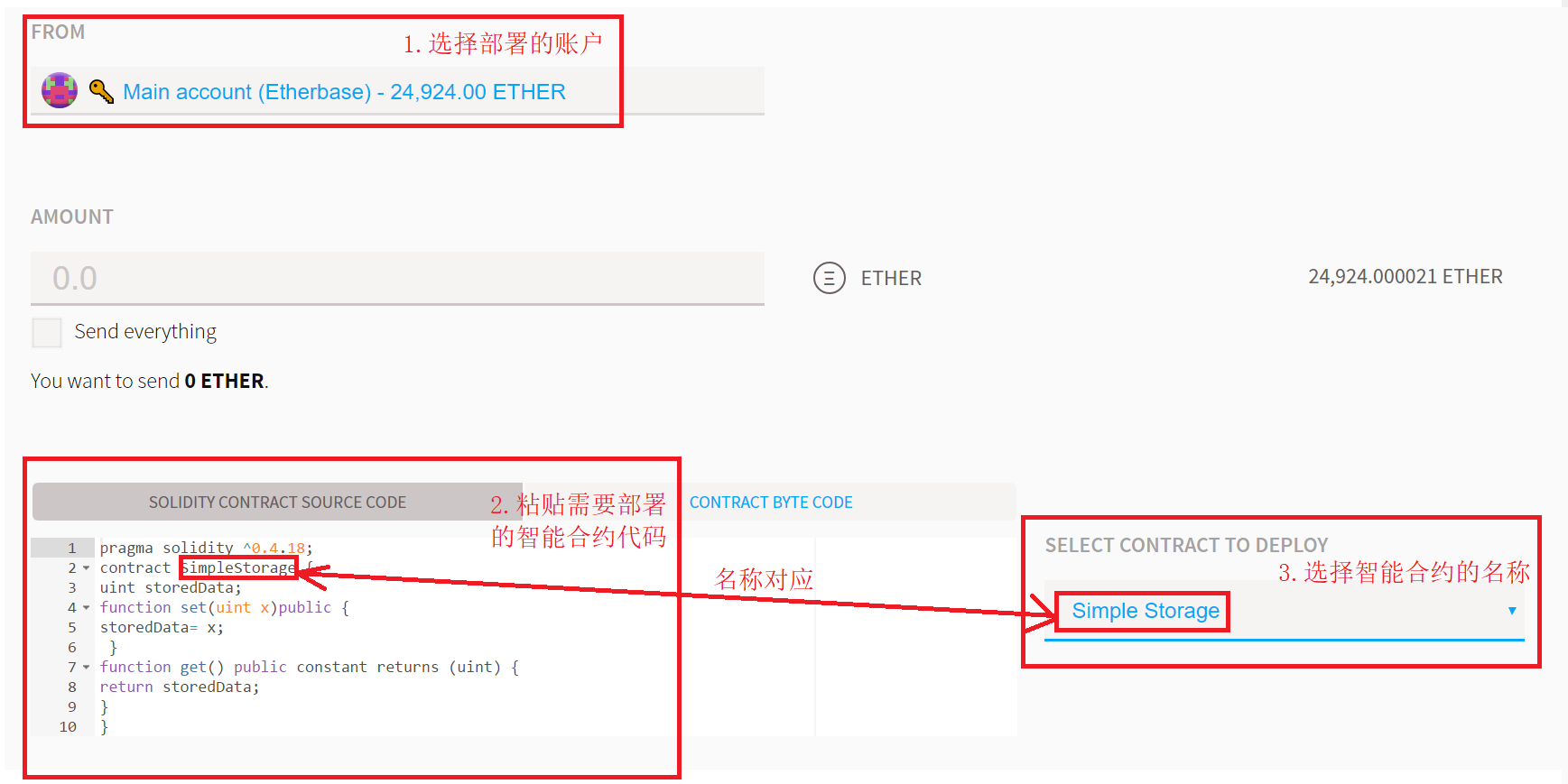 2.智能合约部署过程,详细如下图,完成之后点击左下角的 DEPLOY 按钮