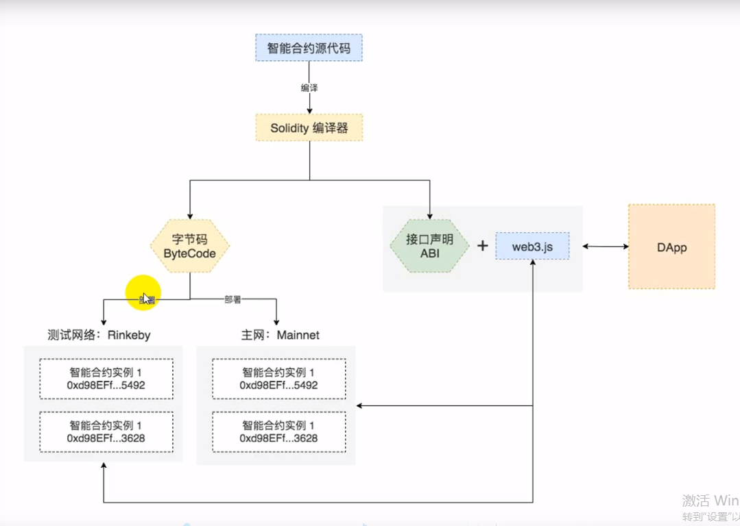 - 用Solidity编写的只能合约源代码需要先使用编译器编译为字节码(Bytecode),编译过程中会同时产生智能合约的二进制接口规范(Application Binary Interface,简称ABI)。