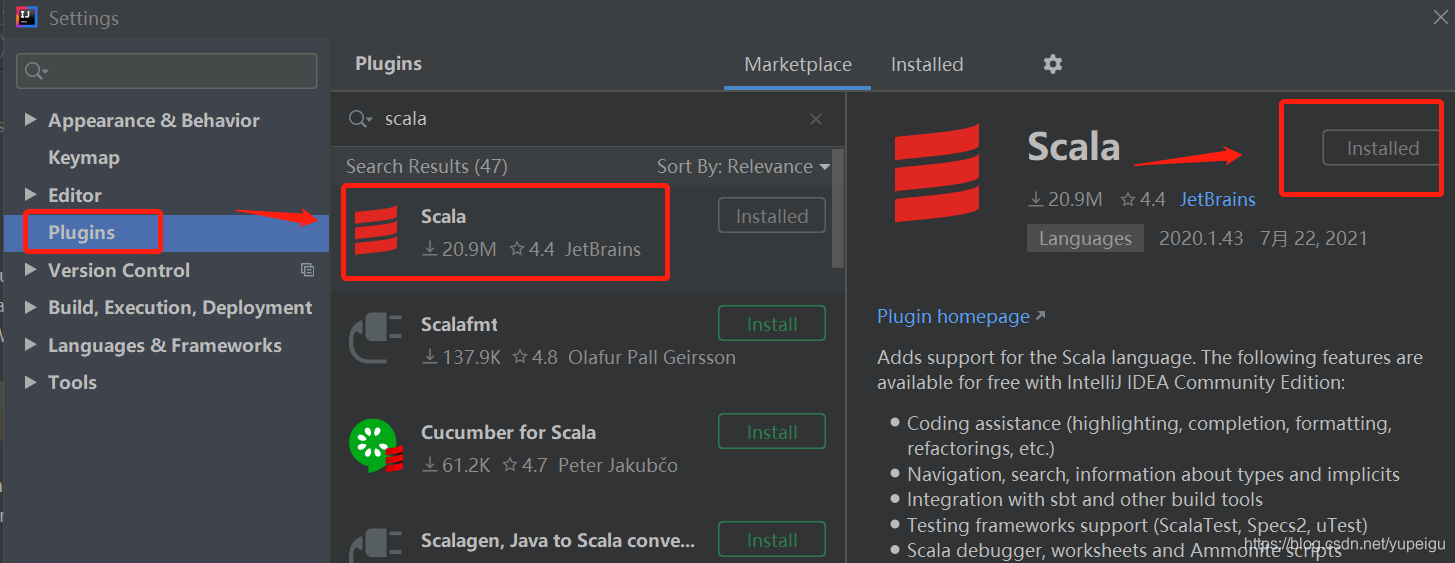 通过菜单 File -》Settings 进入如下页面,然后输入 scala 找到要安装的插件,点击 安装。按照提示,需要重启 IDE。