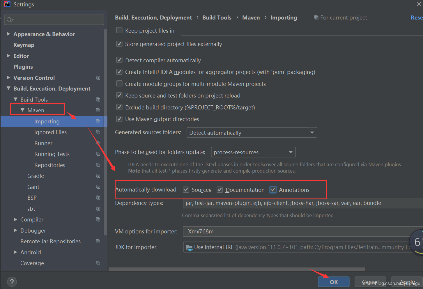 ?然后 继续点击 Maven 左侧的向右的三角形,展开子菜单,点击 Importing ,再勾选 红色框的3个 复选框,点击 OK 保存。