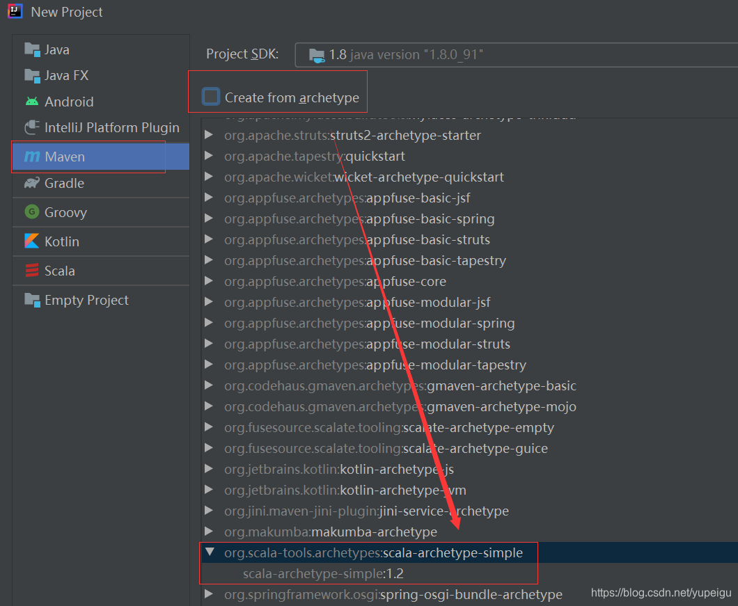 File -》New -》Project,注意 不要勾选 “Create from archetype”,因为?scala-archetype-simple:1.2 版本太低,会有很多问题。?