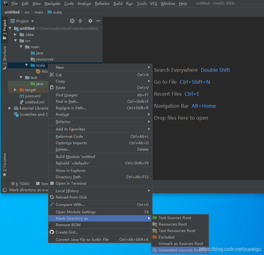 右键 scala 目录 -》Make Directory as -》Generate Sources Root